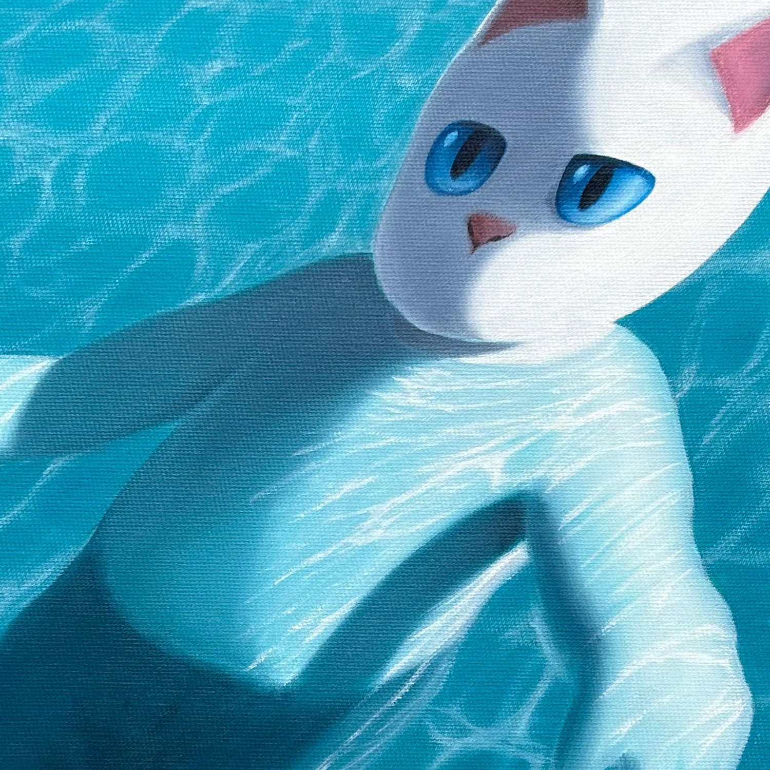 In recent works, Yokoteen has focused this narrative on the tranquility of the sea, following a humanoid cat named Giovanni through the various stages of surfing. Giovanni embodies the duality of the sport, both carving through perfect barrels and quietly waiting for the next wave.